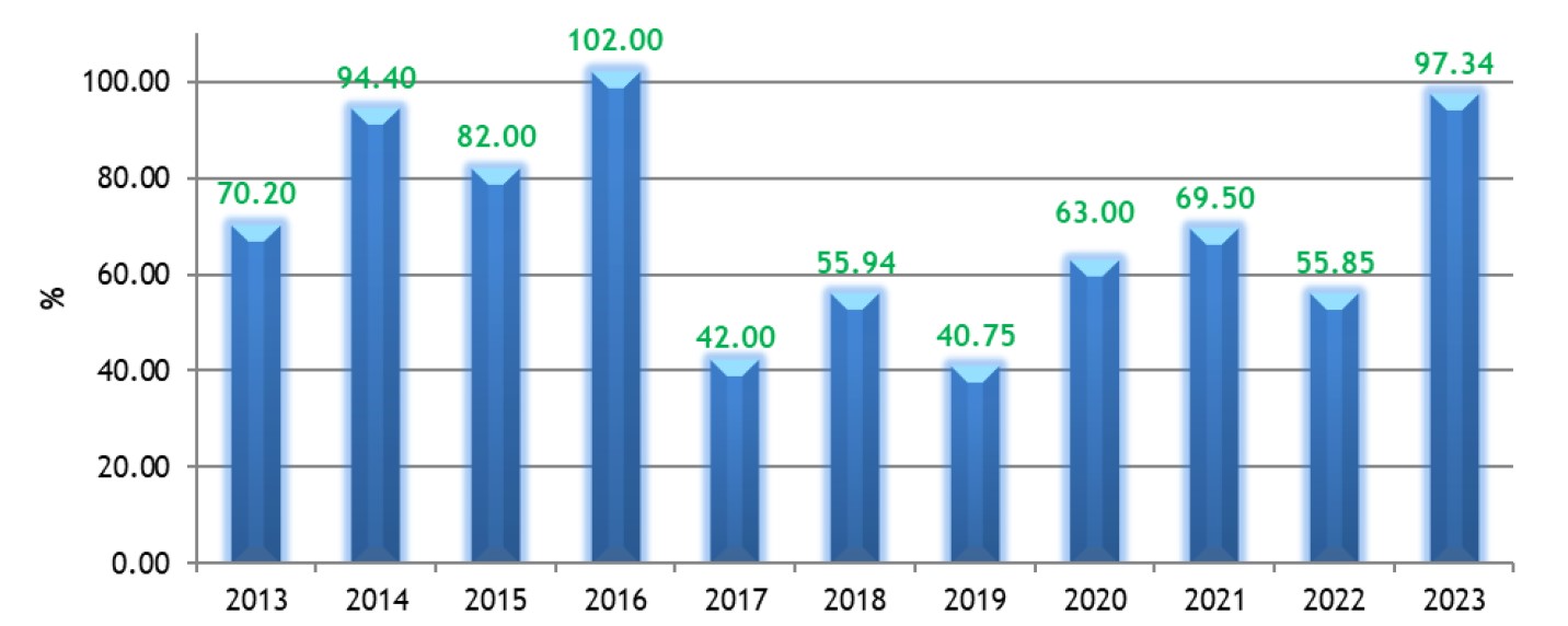 The table below shows the evolution of the reserves replacement ratio between 2013-2023:
